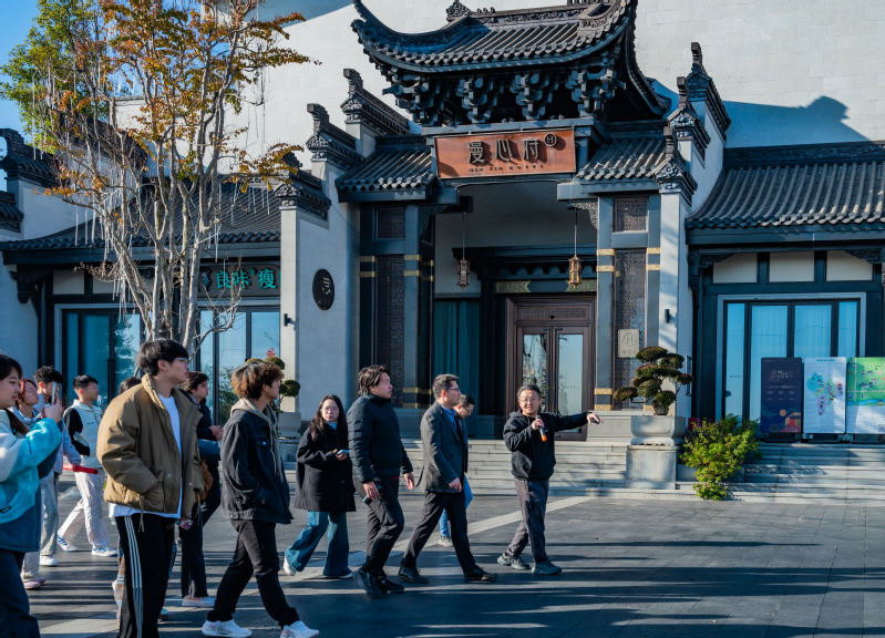 被誉为“城市文化客厅”的鹿鸣山文化院街,融合了传统意蕴与现代设计语言,如同一部立体教科书。师生们带着专业眼光观察思考,穿行于高低错落的院落之间,跟随衢州景富文创置业有限公司设计总监张鹤立的讲解,深度了解建筑的立面风格、传统工法与景观布局,领略不同风格元素与本地文化相融合的应用与魅力。